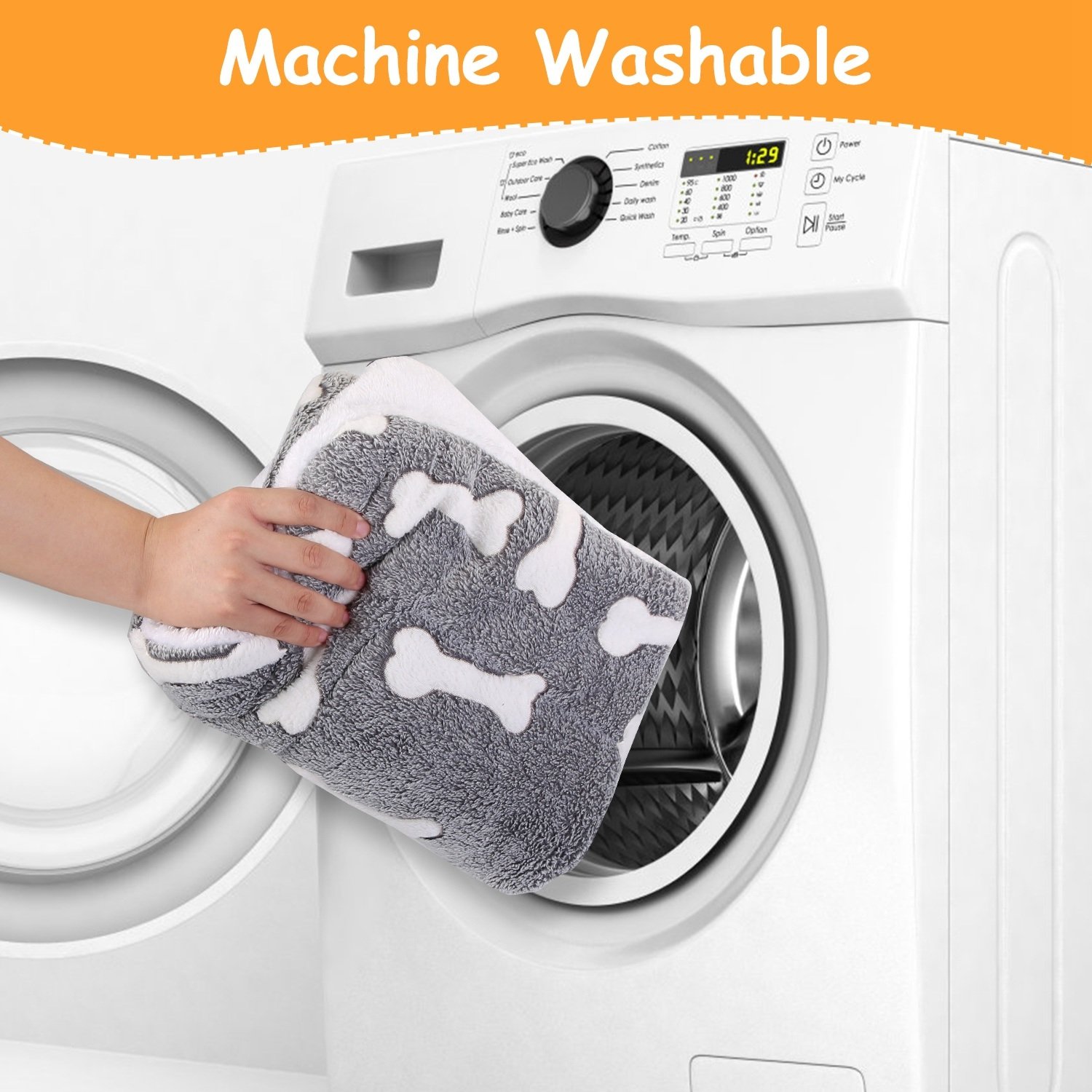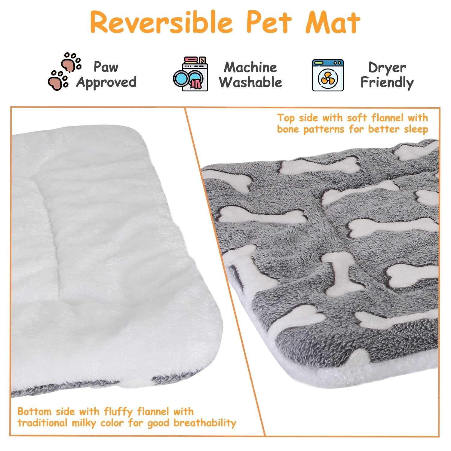 *Dual-Side Soft Mat*:With the top side designed with soft flannel with bone patterns and the bottom side designed with fluffy flannel with traditional milky color,these dog mat is dual-side usage for better warm effect,so your pet can get a more comfortable sleep effect.